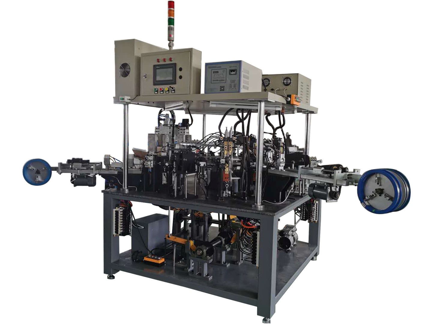 鉬桿校直→U型→U型焊接鉬片→雙鉬桿校直對接→燒夾玻璃芯柱→接鎳絲→鎳絲打鉤→掛燈絲(可選自動或手動上燈絲)→燈絲整形→燈絲預熱→上電子粉→烘干→自動卸料(料盒或傳輸帶)