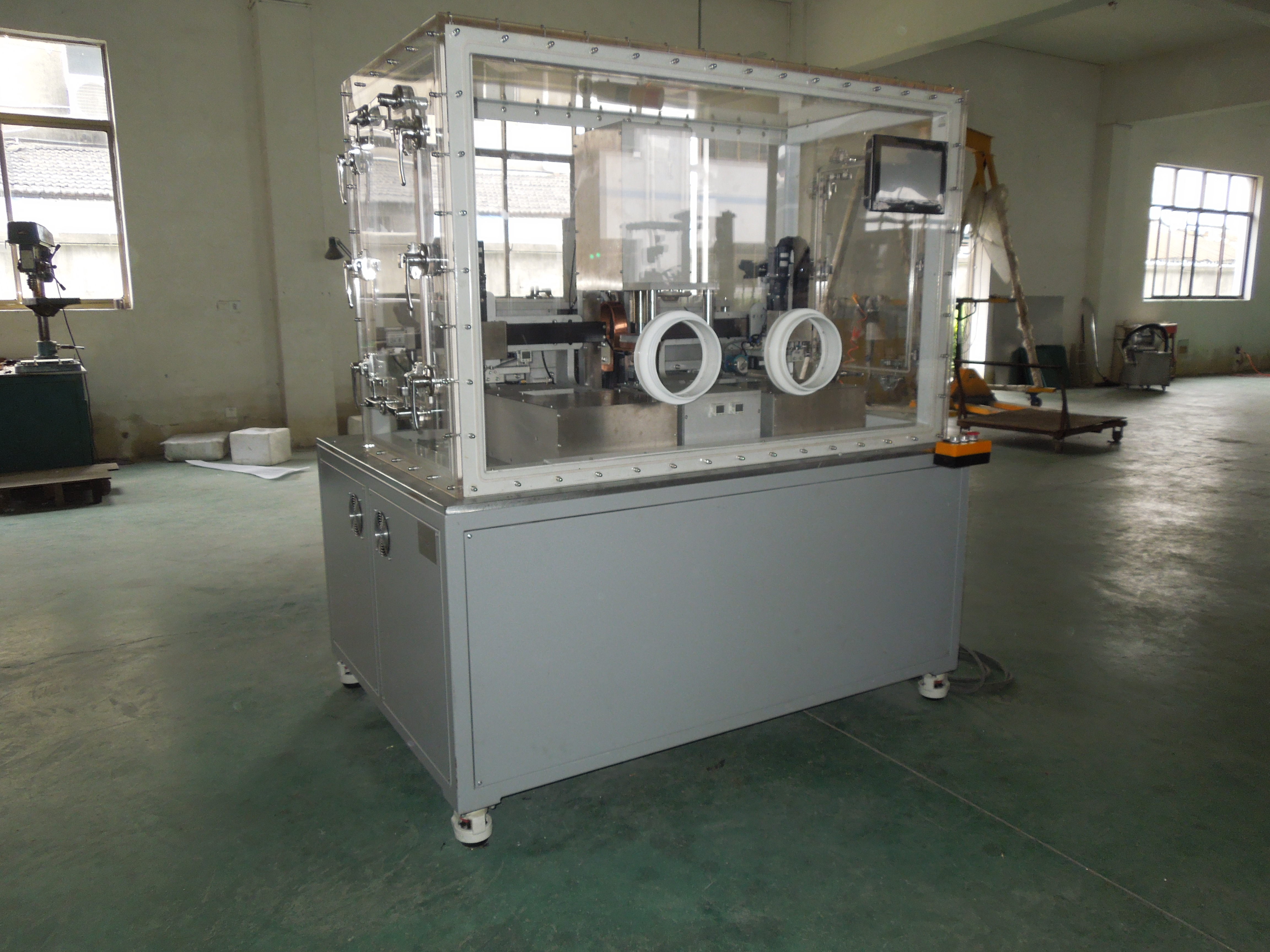 1、 上道工序完成后的管帽、底座放置于模板上,進(jìn)提籃,將提籃放入主機(jī)中,開始自動焊接封裝,整個提籃中的組件焊接完成后,更換提籃。